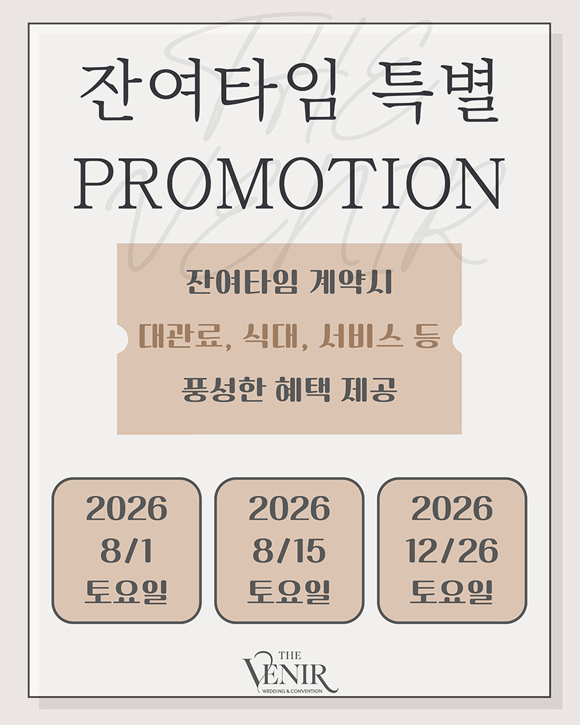 이벤트 상세 혜택 2026년 잔여타임 특별 프로모션 2026년 잔여타임 계약시 대관료, 식대, 서비스 등 풍성한 혜택 제공 이벤트 기간 : 2026/03/14 ~ 계속 TEL : 031-484-8300 이벤트 혜택 2026년 잔여타임 계약시 대관료, 식대, 서비스 등 풍성한 혜택 제공자세한 사항은 예약실로 문의주세요.대표전화 031-484-8300 이벤트 기간 2026/03/14 ~ 계속 목록 이전 이벤트 평일 상담 프로모션 다음 이벤트 소중한 인연, 특별한 기쁨 - 추천 이벤트