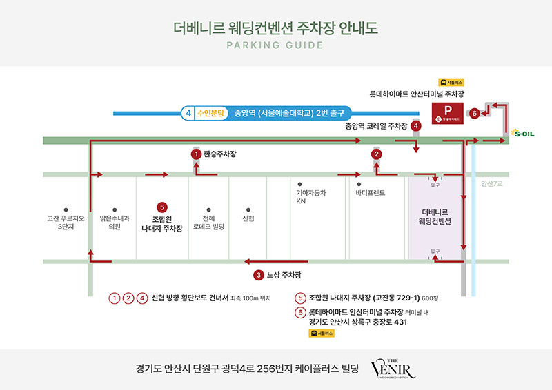 주소 및 연락처 Address 도로명 주소경기 안산시 단원구 광덕4로 256더 베니르 지번 주소경기 안산시 단원구 고잔동 729-8번지 대표전화 031-484-8300 팩스번호 031-484-8313 네이버 빠른길 찾기 → 네이버 지도 크게 보기 → 약도 및 교통 안내 Subway 지하철 4호선수인분당선 중앙역 2번 출구 2번출구에서 50m앞 정면 횡단보도를 건넌 후 왼쪽으로 오시면 바로 더 베니르입니다. 버스 이용시 중앙역2번출구 정류장 하차 [18361] 일반버스 3, 7, 9, 10, 60A, 60B, 62, 70A, 71, 71-1, 76, 77, 80B, 80C, 123, 123-1 실시간 버스노선 자가용 이용시 네비게이션 : "더 베니르" 또는 "031-484-8300" 입력 주소 검색 : "안산 광덕4로 256" 또는 "안산 고잔동 729-8" 검색 네이버 빠른길 찾기 약도 인쇄 및 다운로드 약도 인쇄하기 약도 다운로드(PDF) 더베니르 주차장 안내도 주차장 약도 인쇄하기 주차장 약도 다운로드 주차장 안내 주차 1,000대 가능 ①②중앙역 환승 & 공영주차장 ③더 베니르 후문 대로변 공영주차장 ④쏘가중앙역 코레일주차장경기도 안산시 단원구 중앙대로 918 ⑤조합원 나대지 주차장(고잔동 729-1) ⑥롯데하이마트 안산터미널 주차장경기도 안산시 상록구 충장로431에스오일 입구 (셔틀버스 운행) 2시간 무료 안내사항 주차 요원의 안내를 받으세요. 주차장이 혼잡할 수 있사오니 대중교통을 이용해 주시기 바랍니다.